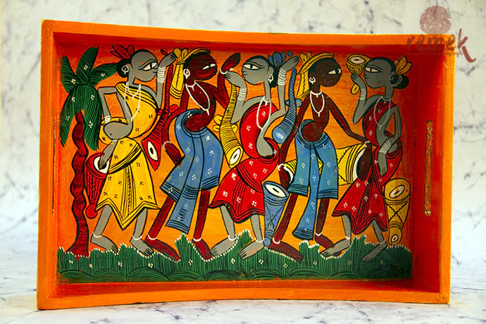 Wall hanging is a decorative handicraft of West Bengal, made by using various materials such as cloth, paper, metal, wood, bamboo, and clay. The wall hangings display artistic designs and motifs influenced by the culture, religion, and history of the state. Some of the common themes are folk tales, festivals, deities, animals, and flowers. Wall hanging is a popular souvenir and gift item, as well as a way of beautifying the interiors of homes and offices.